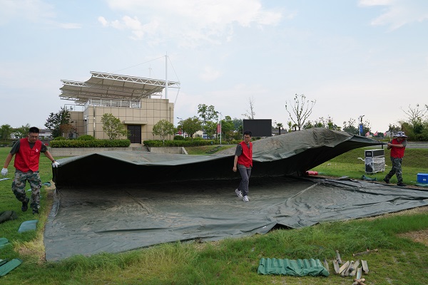中心青年志愿者在活动现场,身着红色志愿服务马甲,积极投身到全省防汛抢险大演练场地整理恢复中。他们分工协作,有的拆卸指挥帐篷、有的转运沙包、有的清洁维护设备设施......炎炎夏日,骄阳似火,中心青年志愿者团结协作、挥汗如雨,现场紧张有序,充分展现了新时代水利青年良好的精神风貌。在大家的共同努力下,训练场地又恢复了往日的干净、整洁,阳光的训练场就是一颗长江北岸的明珠。